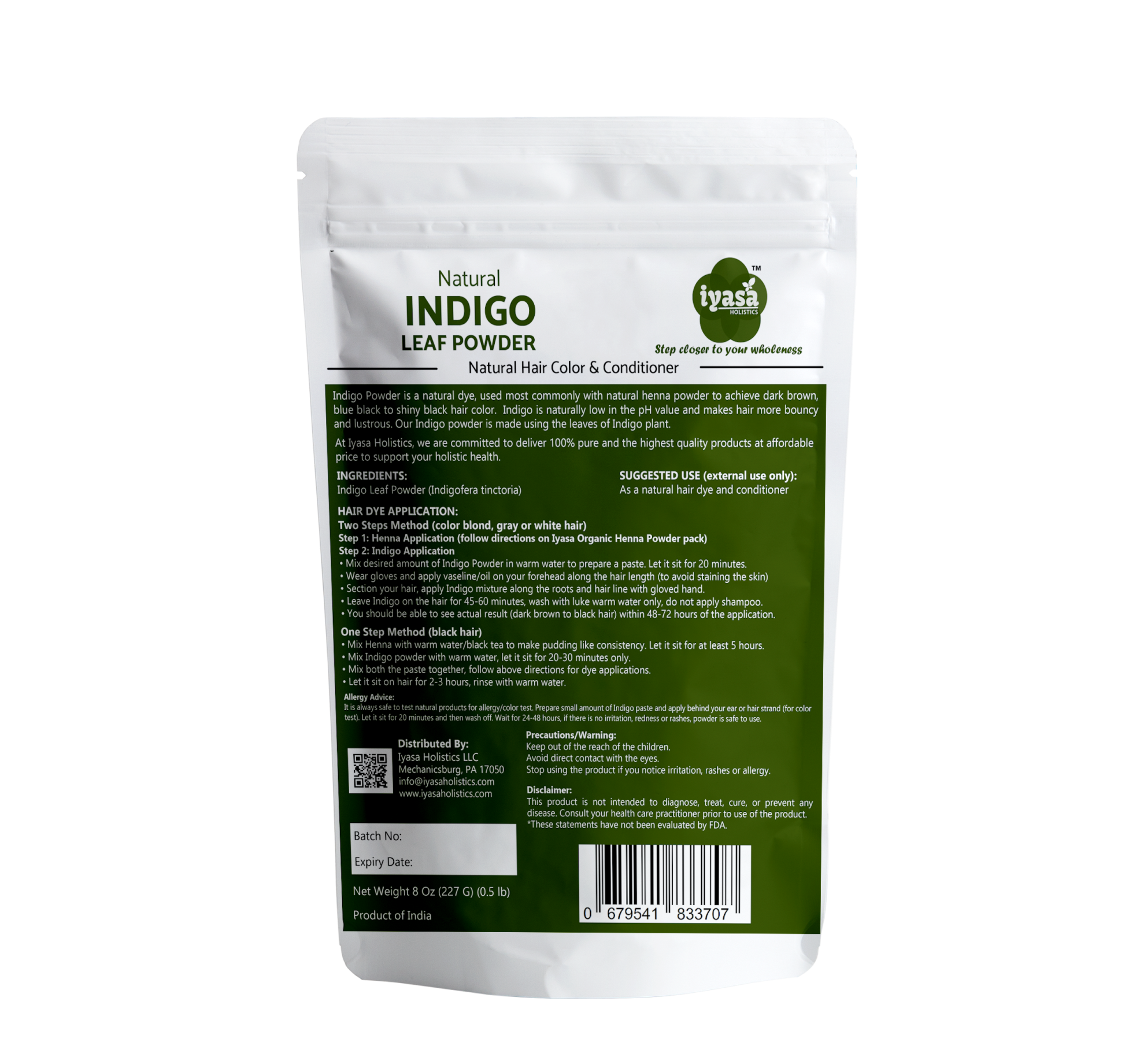 🍀 NATURAL, PURE, MIXES EASILY:Â Our Indigo powder is 100% pure and natural, triple sifted fine powder. It mixes easily with water and make smooth paste for easier application. It is free of ammonia, paraben, PPD and other harsh chemical, Free of any additives or preservatives. Iyasa Holistics Indigo powder is an excellent natural alternative for the people who are allergic to chemical dyes. Avoid skin irritations and fumes from the chemical hair dye, include natural alternative to support your health and environment.