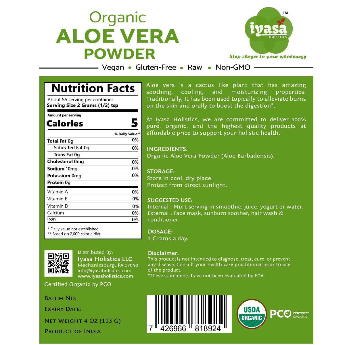 🍀CERTIFIED USDA ORGANIC, NON-GMO:Iyasa Holistics Organic Aloe Vera Leaf Powder is sourced from NOP (USDA) certified farms of India and packaged in FDA registered facility. Our powder is Non -GMO,Vegetarian and Vegan: Gluten, Soy, Wheat and corn free .