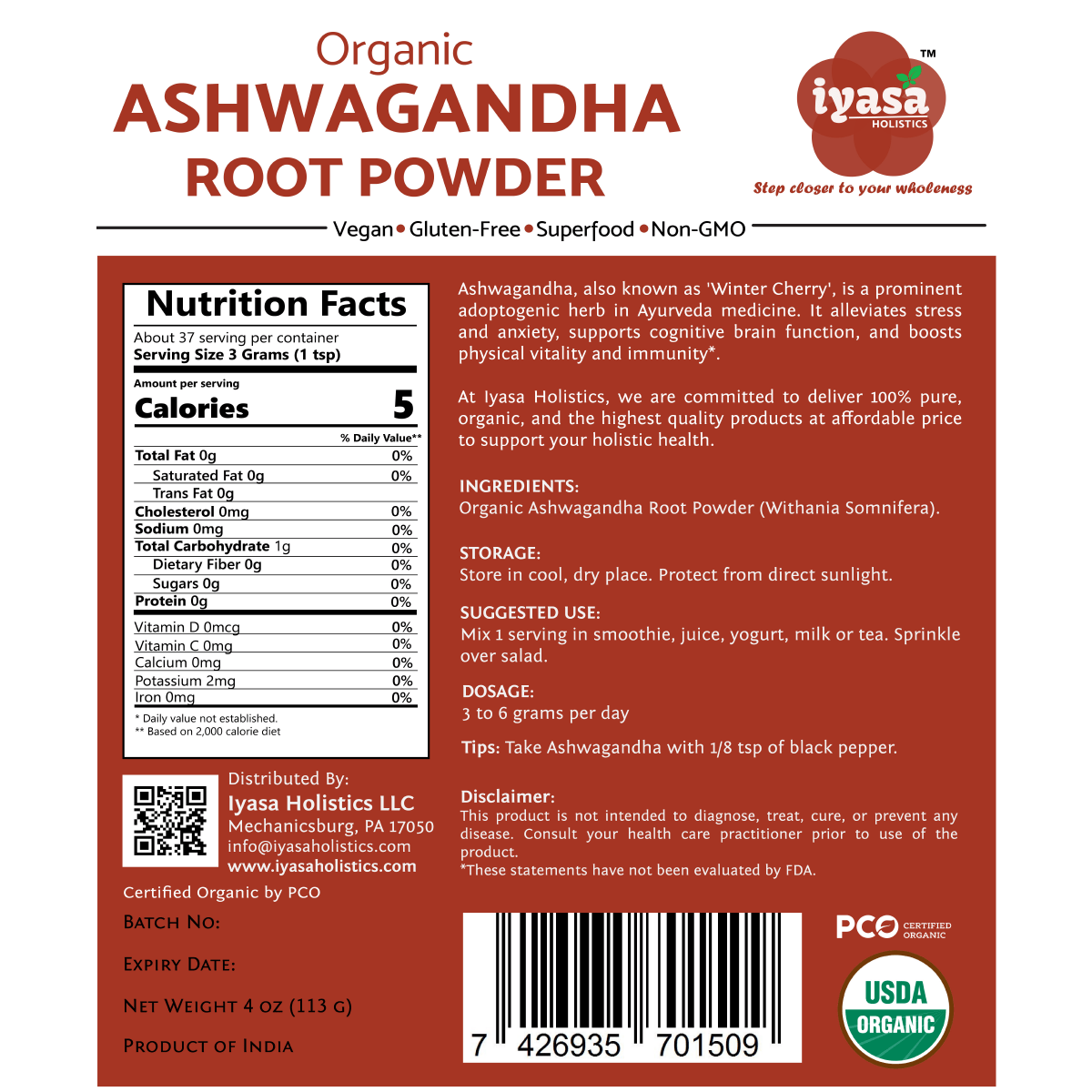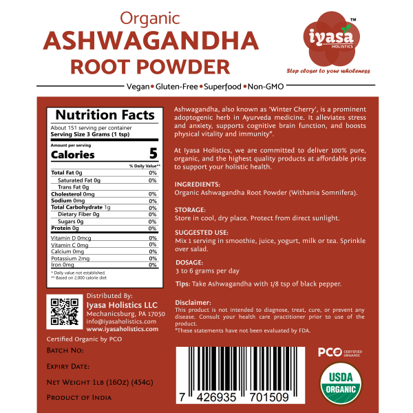 🍀CERTIFIED USDA ORGANIC, NON-GMO: Iyasa Organic Ashwagandha Root Powder is sourced from NOP (USDA) certified farms of India.It is Non-GMO Project Verified, Vegetarian and Vegan; Gluten, Soy, Wheat or Corn free.