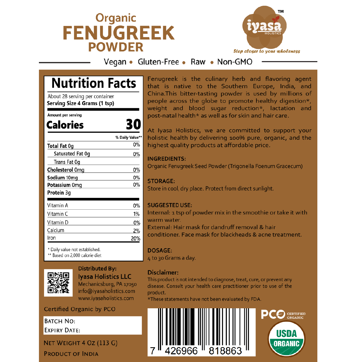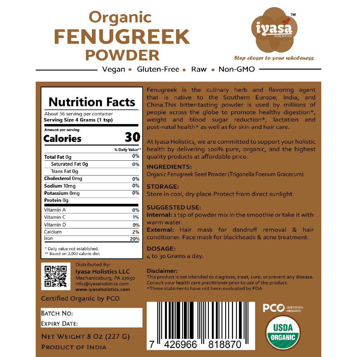 🍀CERTIFIED USDA ORGANIC, NON-GMO: Iyasa Organic Fenugreek Seed Powder is sourced from NOP(USDA) certified farms of India and packaged in FDA registered facility. It is Non-GMO, Vegetarian and Vegan; Gluten, Soy, Wheat and Corn free