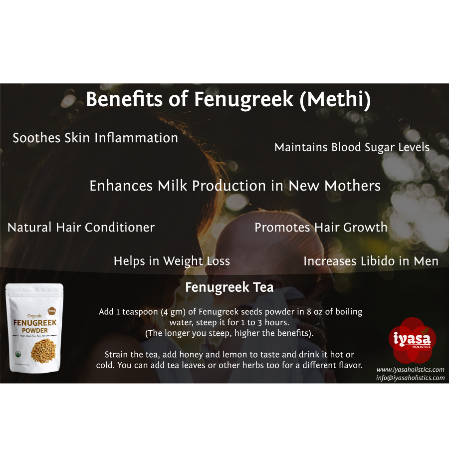 🍀SUGGESTED USES: Iyasa Holistics Fenugreek seeds Powder is 100% Natural and Pure. It is bitter-sweet in taste, pungent in flavor, golden yellow in color, finely powdered, evenly textured and fresh. It is best used as culinary spice and flavoring agent in your favorite dishes for benefit of whole family. As a health supplement, take 4-6 gm of powder with warm water/ fenugreek tea in the morning before having breakfast. Mix powder with water to make paste and use it for your skin & hair care.