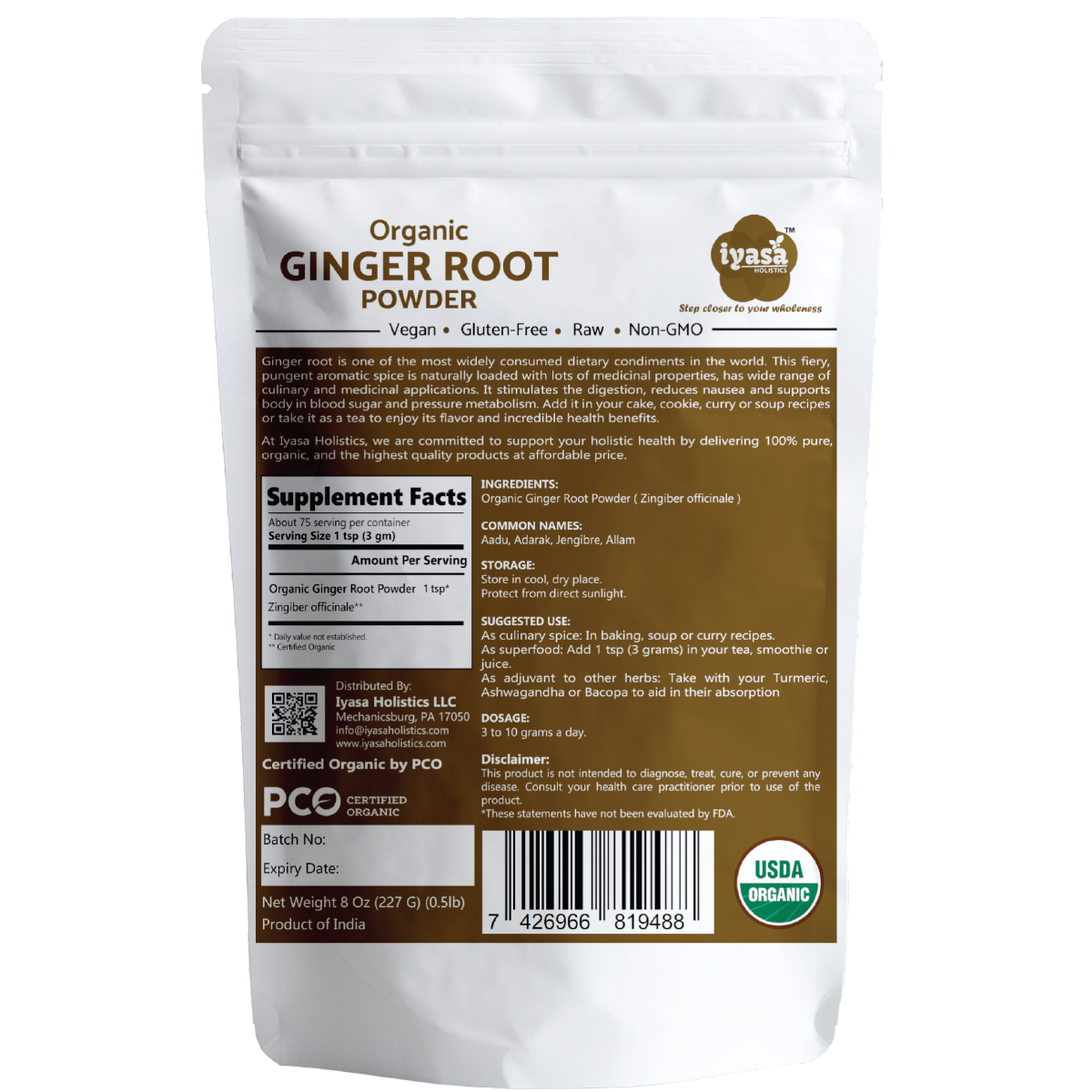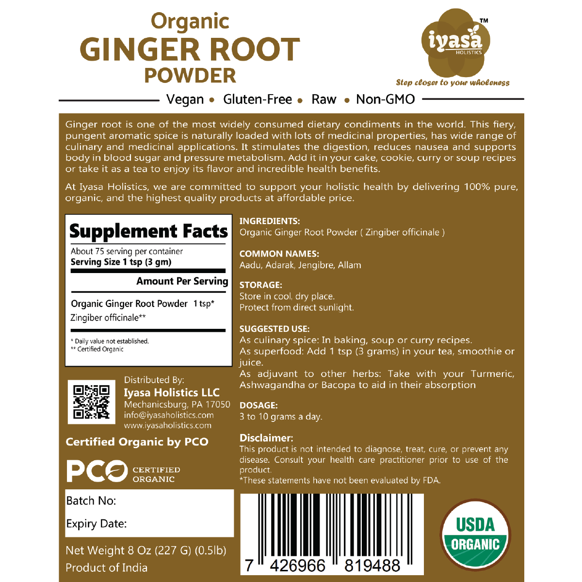 🍀CERTIFIED USDA ORGANIC, NON-GMO: Iyasa Organic Ginger Root Powder is sourced from NOP(USDA) certified farms of India and packaged in FDA registered facility. It is Non-GMO, Vegetarian and Vegan; Gluten, Soy, Wheat and Corn free. It is also devoid of any preservatives or additives.