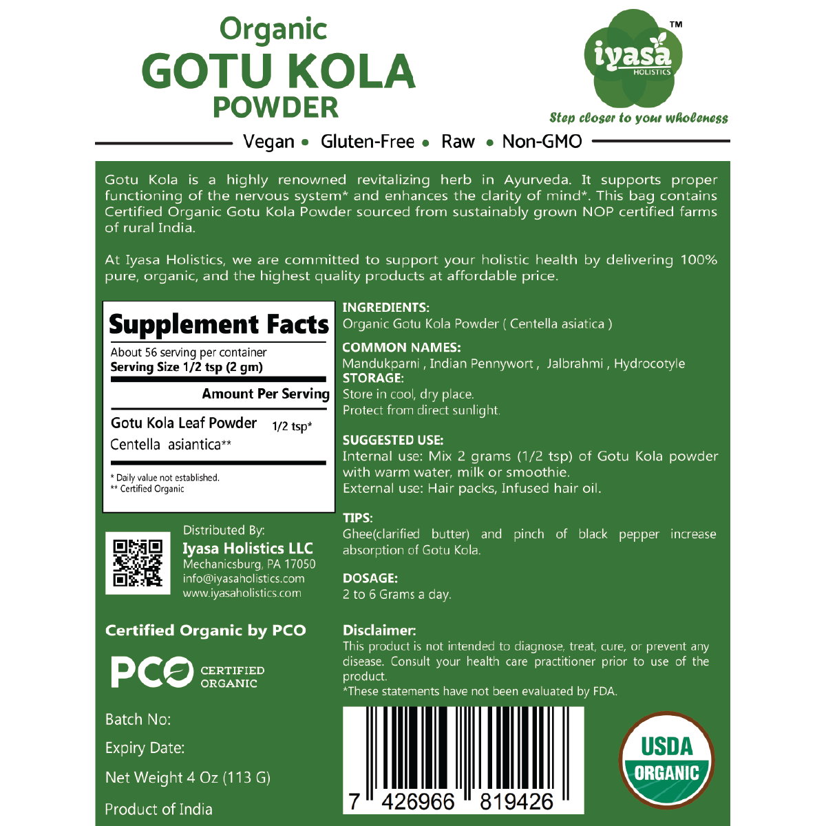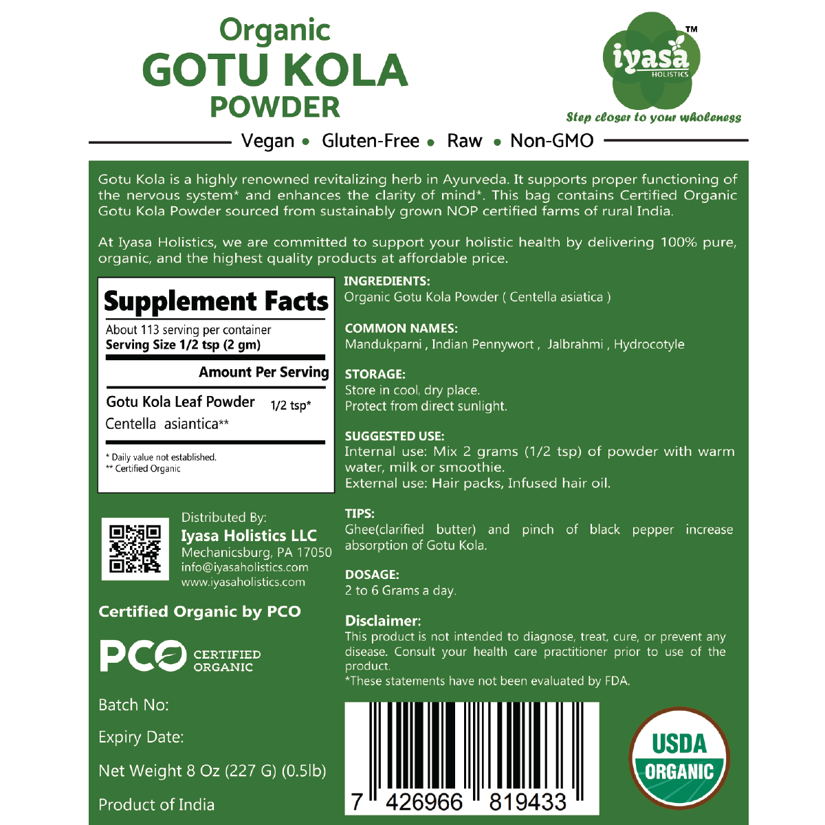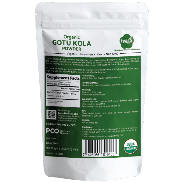 🌿CERTIFIED USDA ORGANIC NON-GMO: Iyasa Holistics Organic Gotu Kola (Brahmi) Leave Powder is sourced from NOP (USDA) certified farms of India. Our Gotu kola Powder is vegetarian, vegan, Non-GMO and Gluten, Soy, Wheat or Corn free.